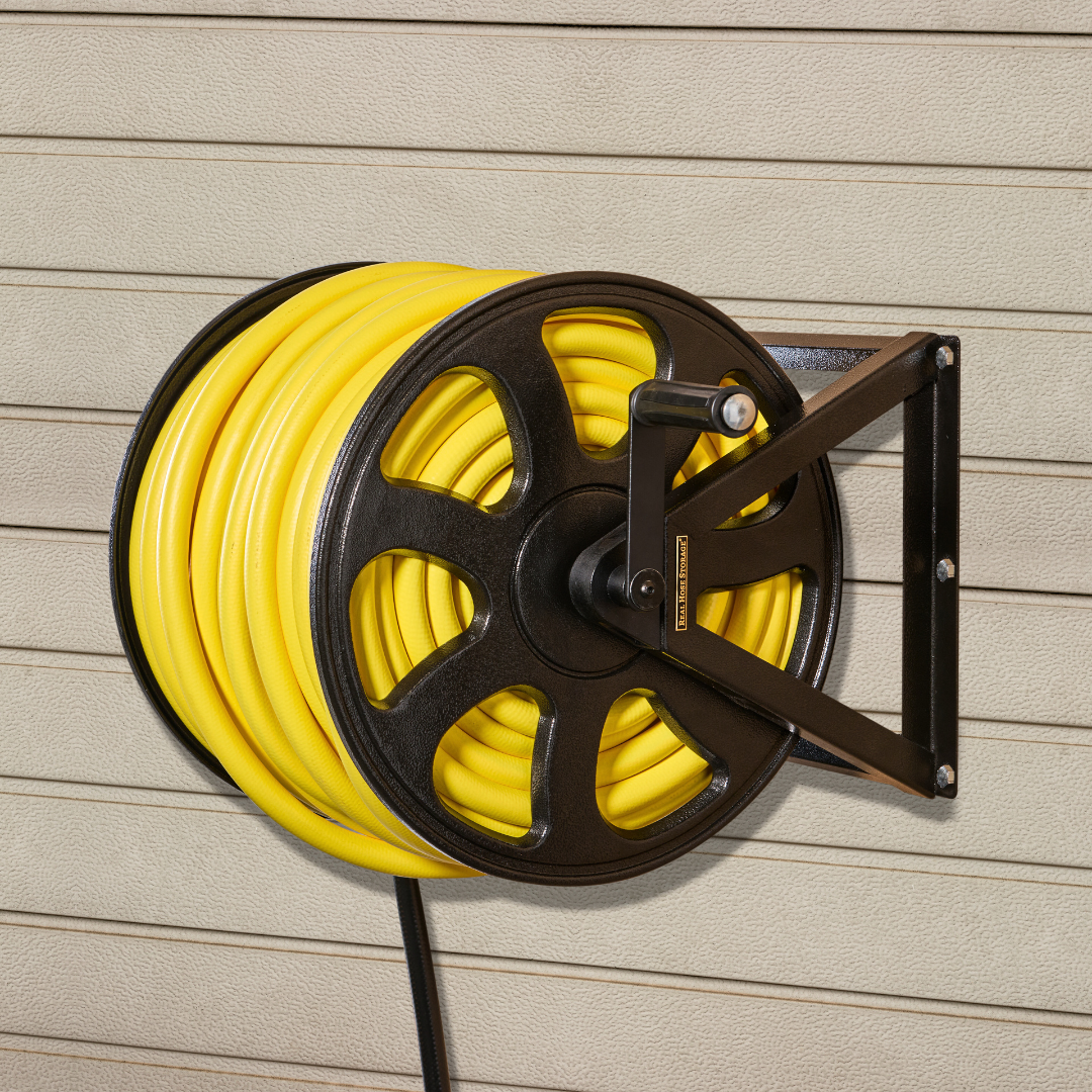 This hose reel mount supports up to 200 feet of standard garden hose.